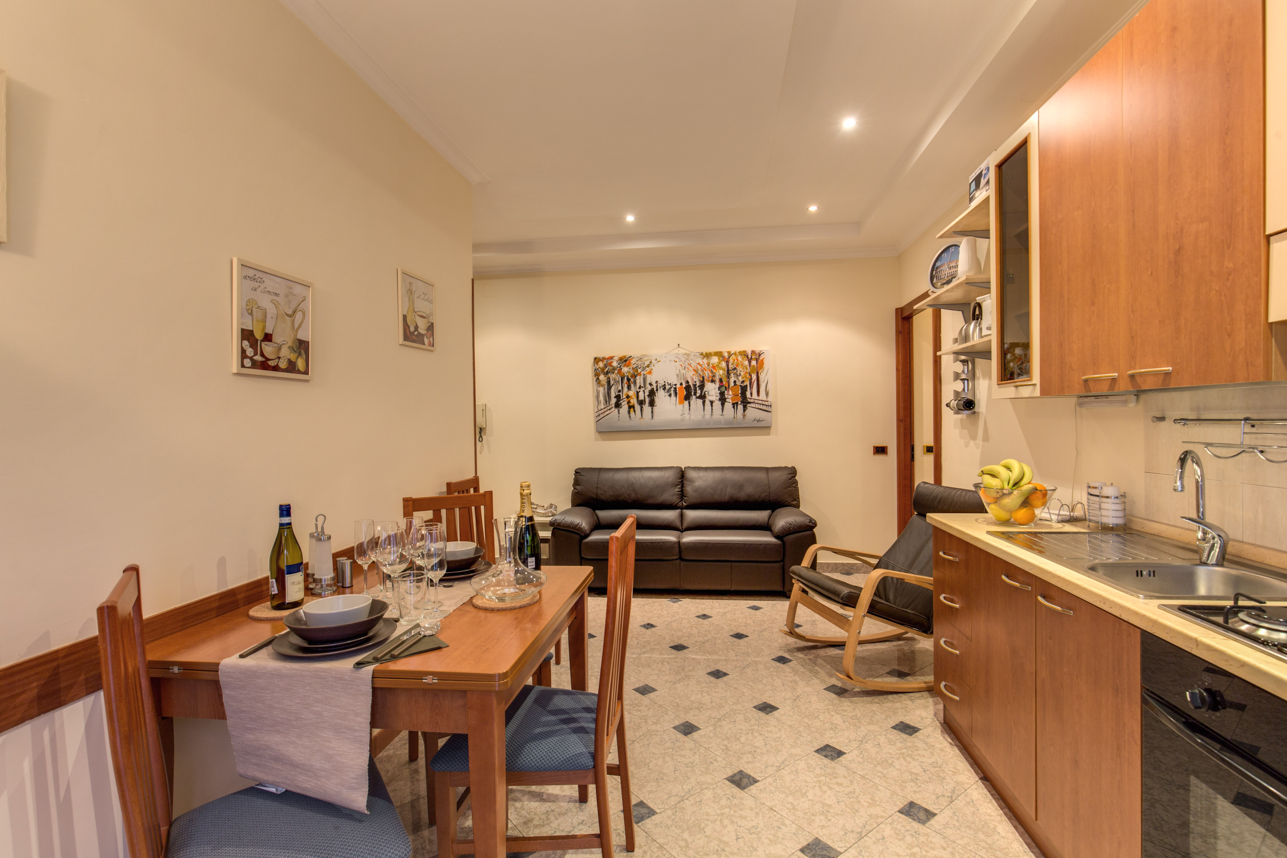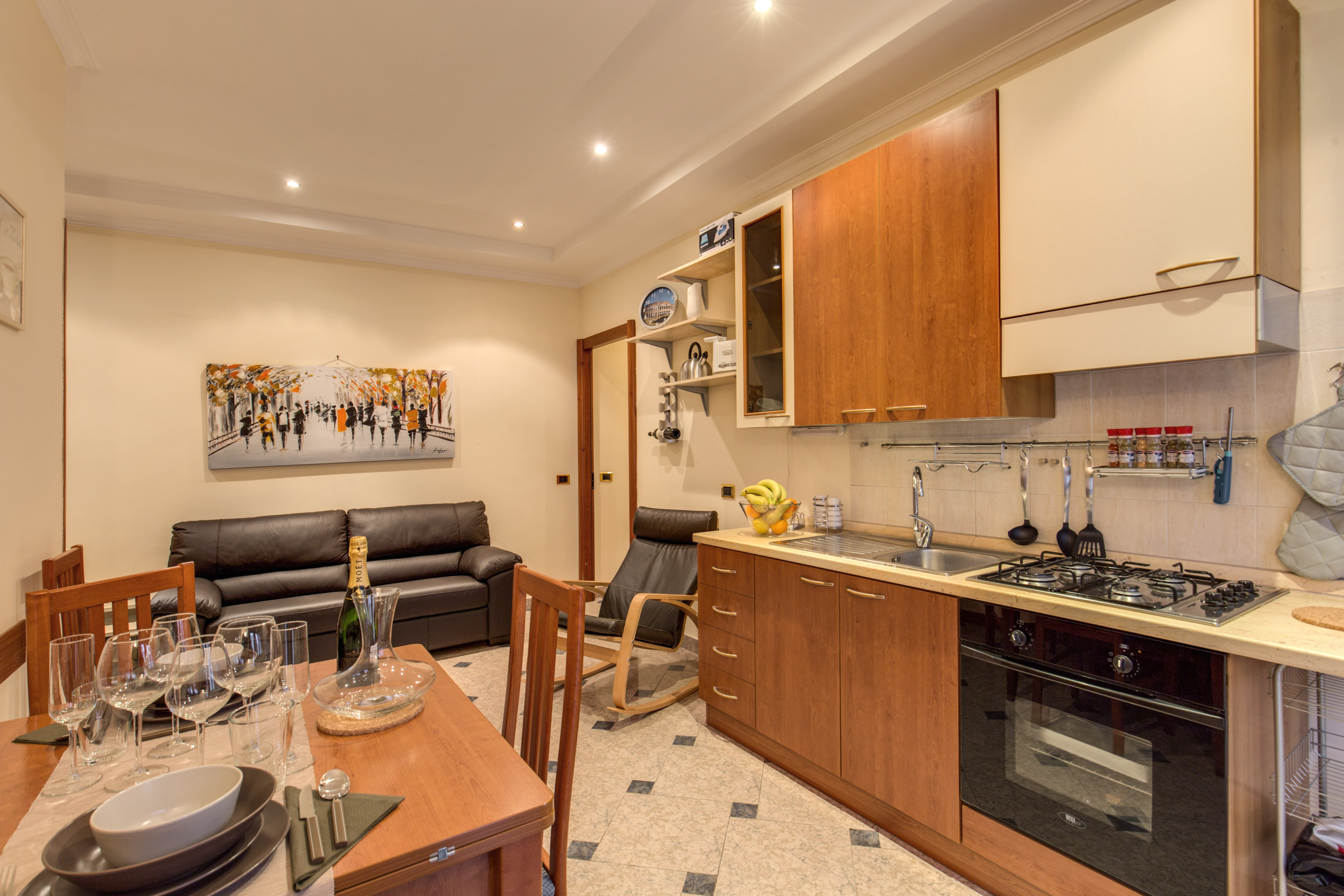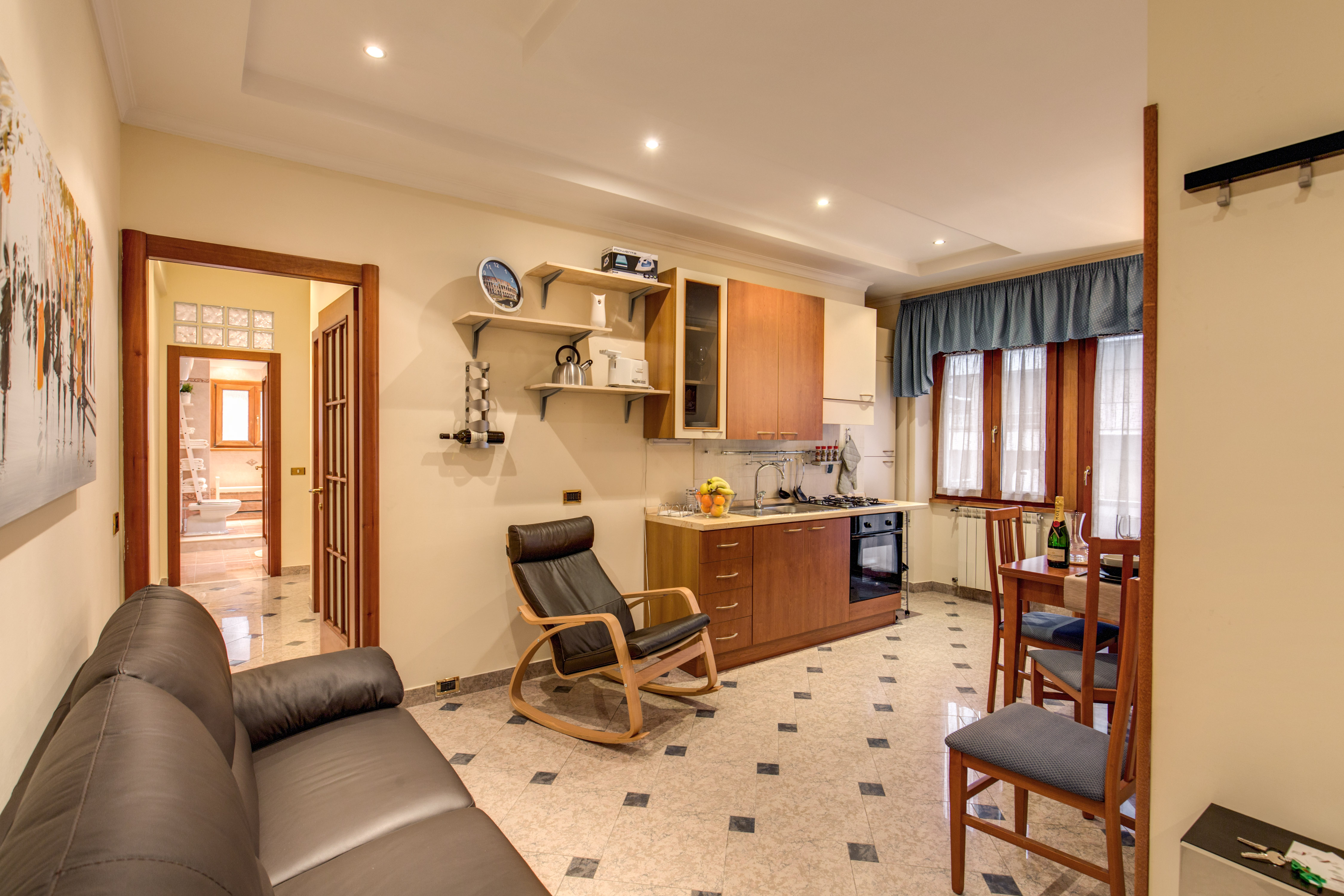 Più precisamente questo appartamento misura 85 mq e ha 5 posti letto, è composto da tre ampie camere, 2 matrimoniali e 1 singola, per un totale di 5 posti letto (ogni camera può essere adattata a diversa tipologia: matrimoniale, doppia e singola) da un ingresso adiacente all’ampia zona giorno arredata con divano a 3 posti, poltrona e TV satellitare. L’angolo cottura, presente in questa zona giorno, è moderno perfettamente attrezzato e comprensivo di un grande tavolo. L`appartamento è dotato di un ampio bagno privato con asciugacapelli, doccia e zona lavanderia.