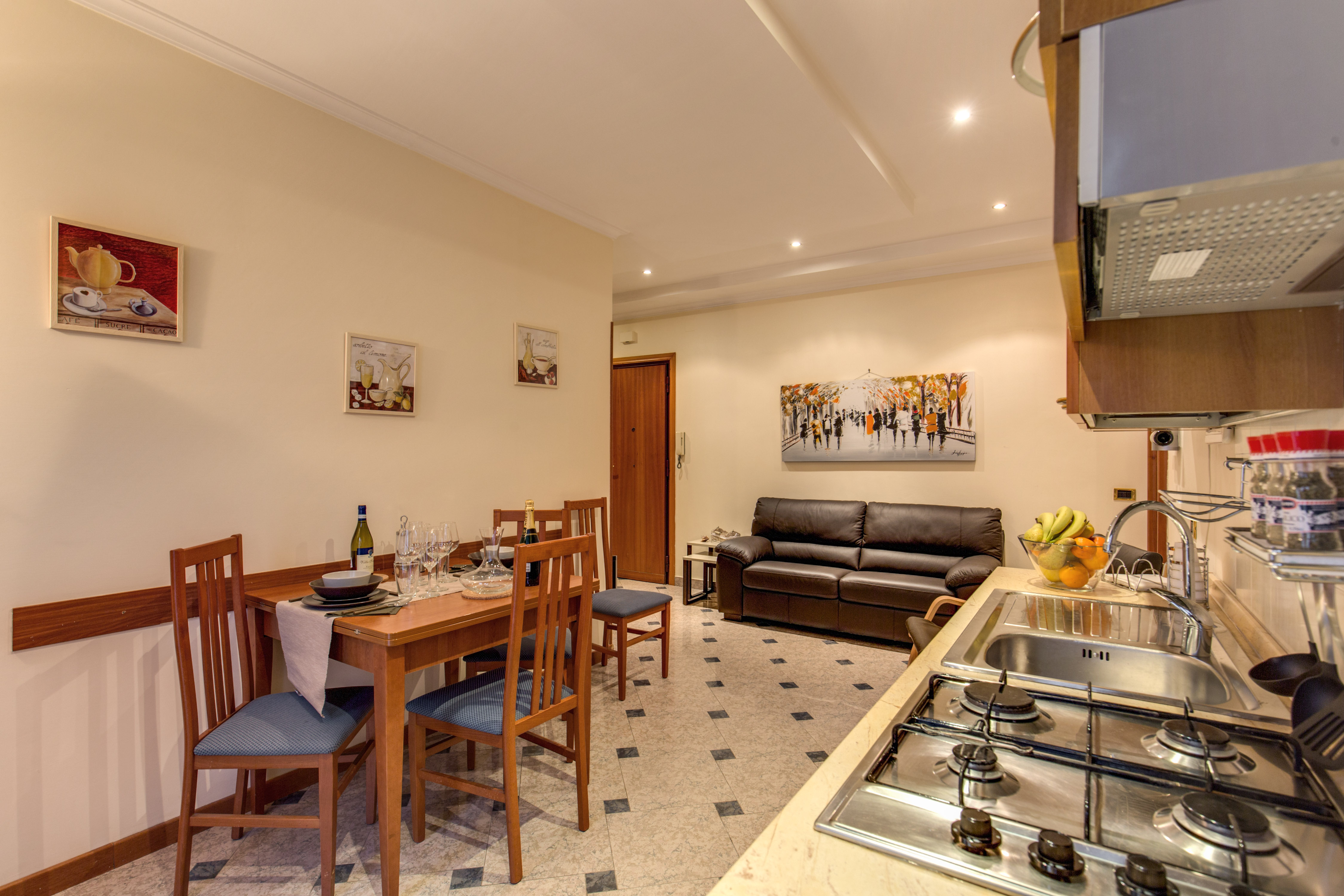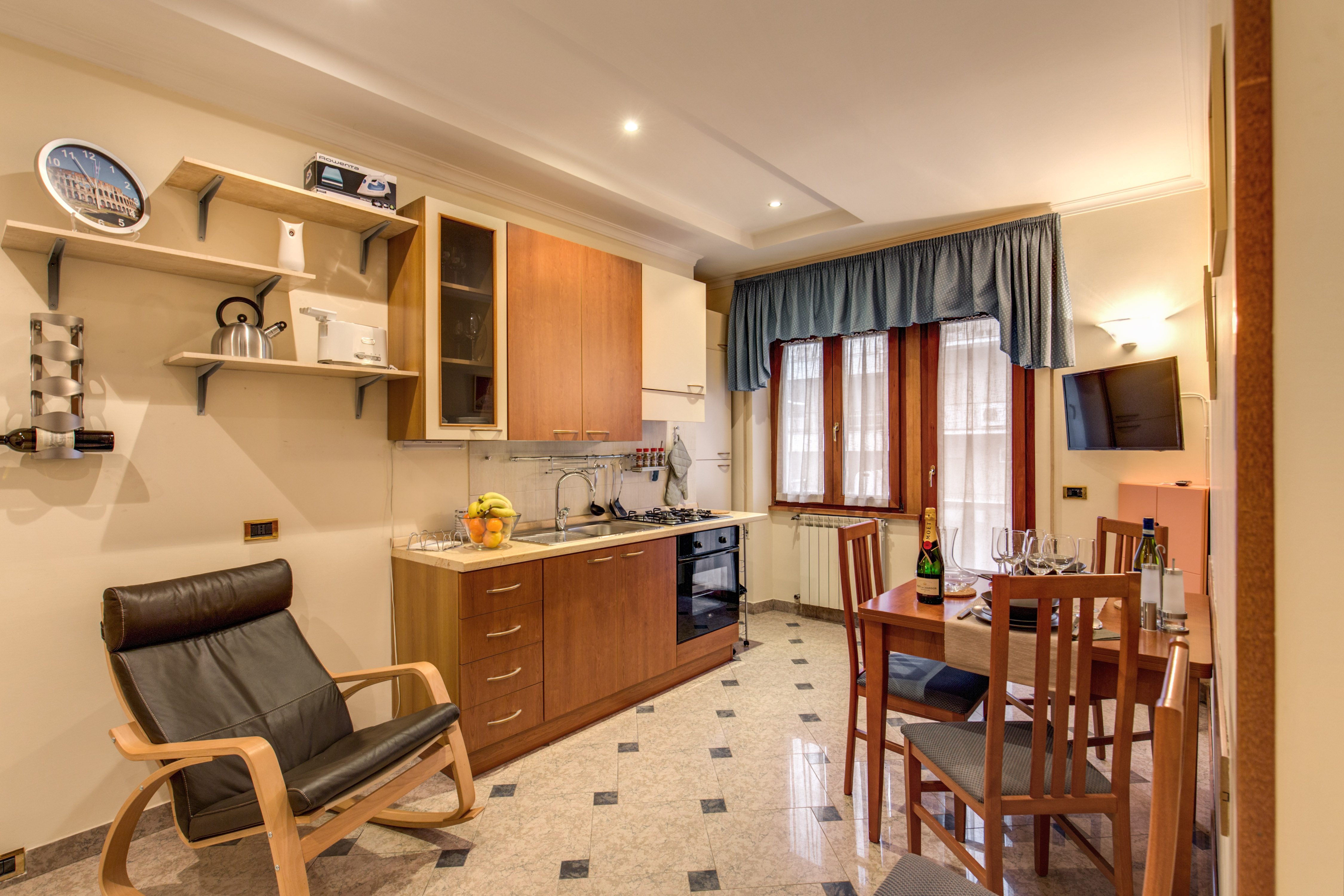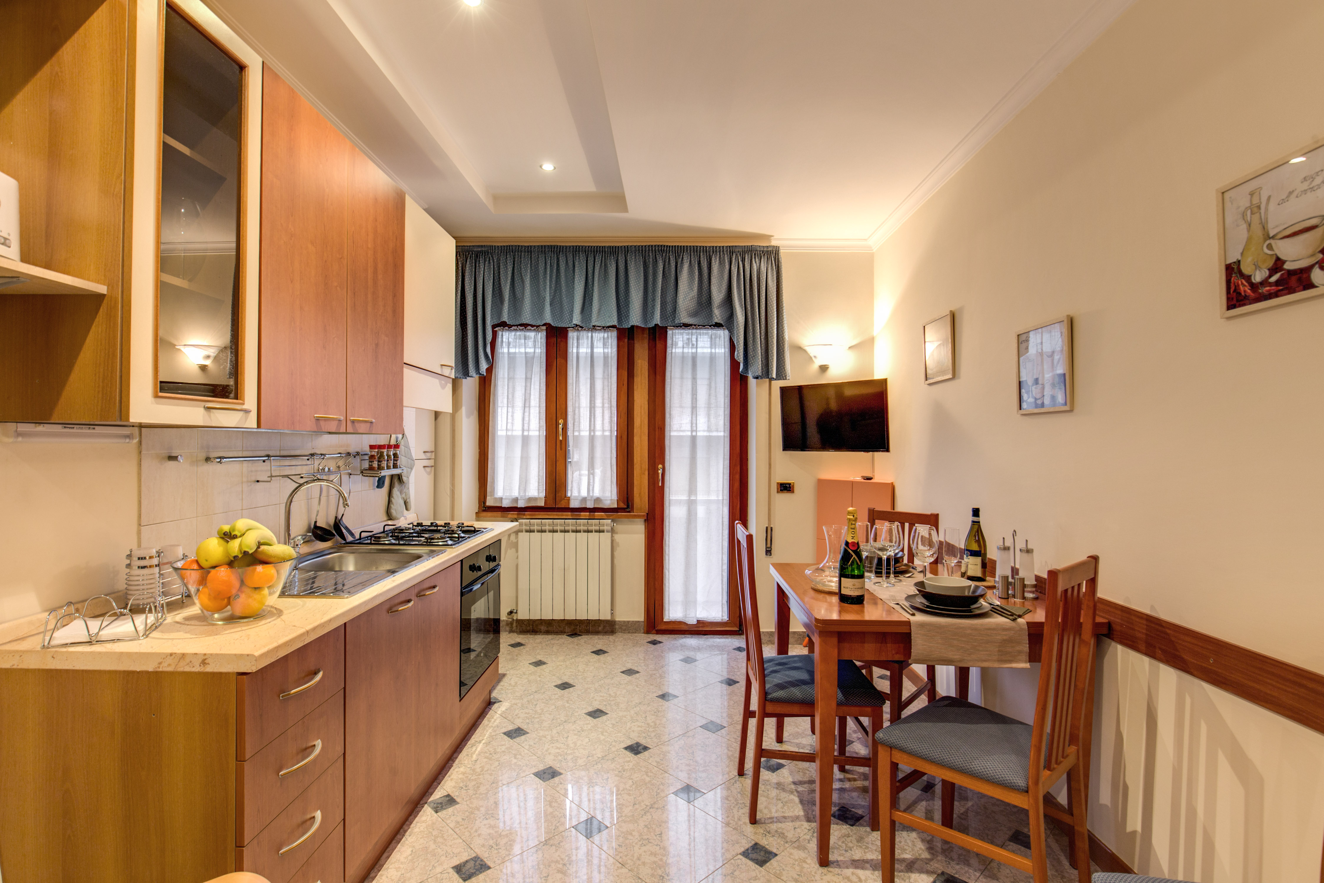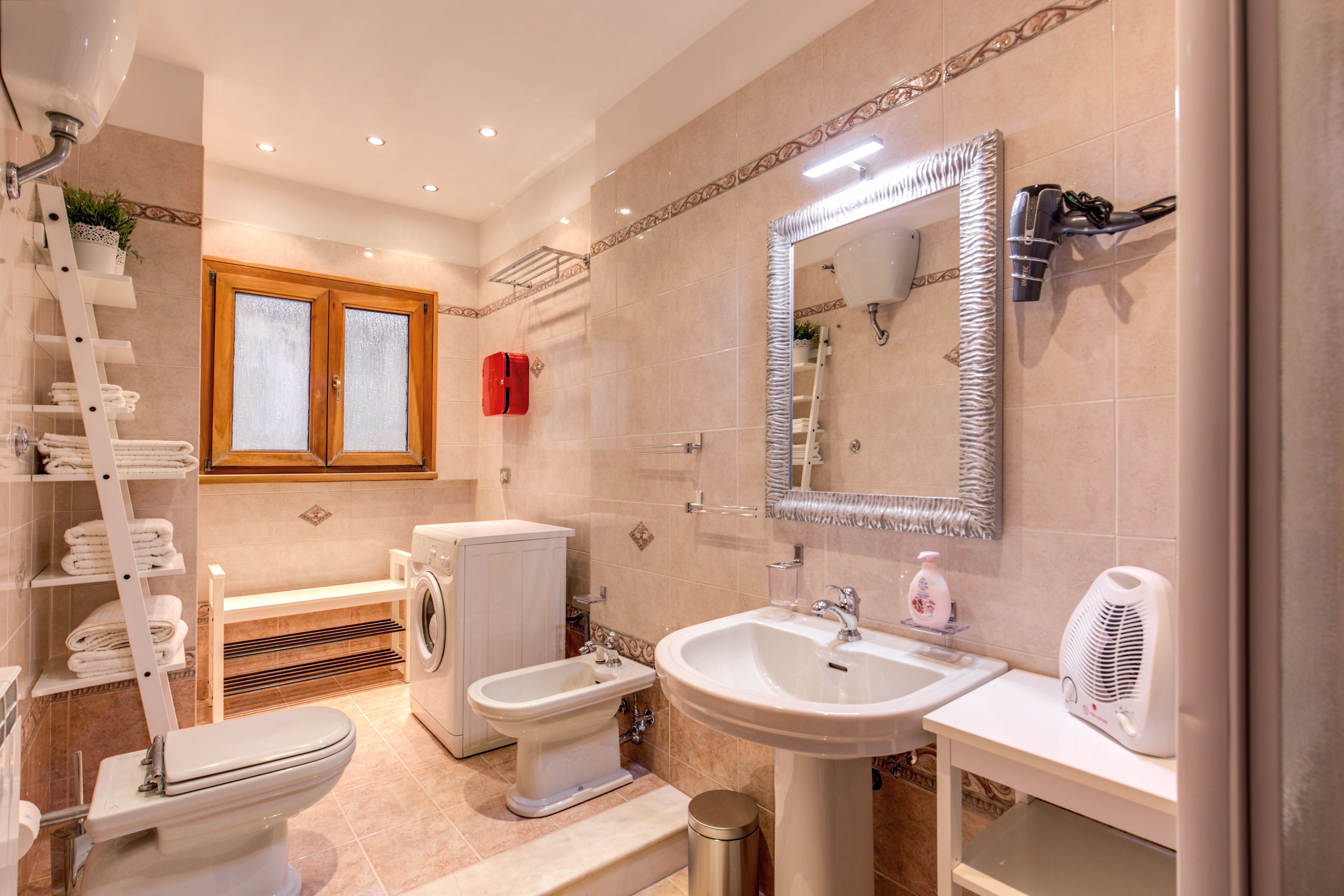 Più precisamente questo appartamento misura 85 mq e ha 5 posti letto, è composto da tre ampie camere, 2 matrimoniali e 1 singola, per un totale di 5 posti letto (ogni camera può essere adattata a diversa tipologia: matrimoniale, doppia e singola) da un ingresso adiacente all’ampia zona giorno arredata con divano a 3 posti, poltrona e TV satellitare. L’angolo cottura, presente in questa zona giorno, è moderno perfettamente attrezzato e comprensivo di un grande tavolo. L`appartamento è dotato di un ampio bagno privato con asciugacapelli, doccia e zona lavanderia.